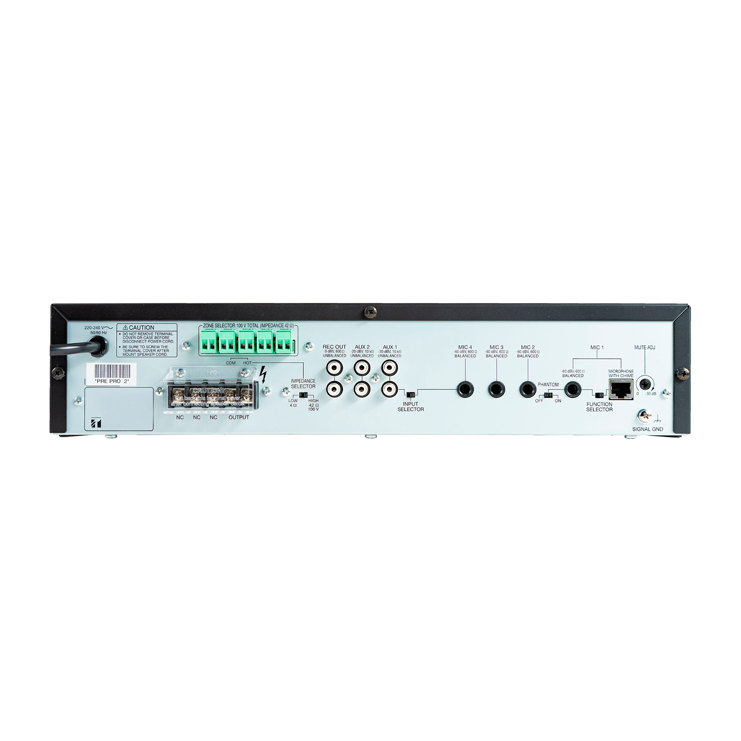 🔹 Salidas para altavoces: 100V, 70V, baja impedancia (4Ω)