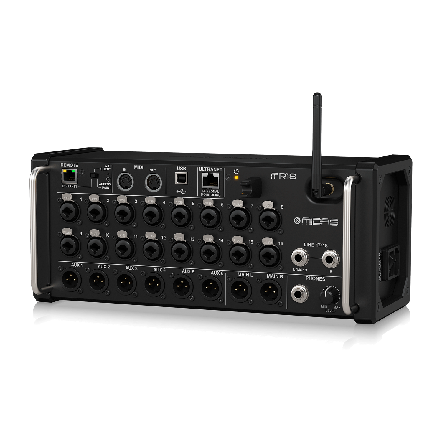 La MR18 es una bestia de mezcla digital que cabe en un rack de 3U. Integra 16 preamplificadores MIDAS, control inalámbrico por tablet o computadora, efectos de calidad de estudio, y una interfaz USB 18×18 que convierte cualquier espacio en una estación de mezcla profesional. Pensada para los que no aceptan concesiones ni en vivo ni en estudio.